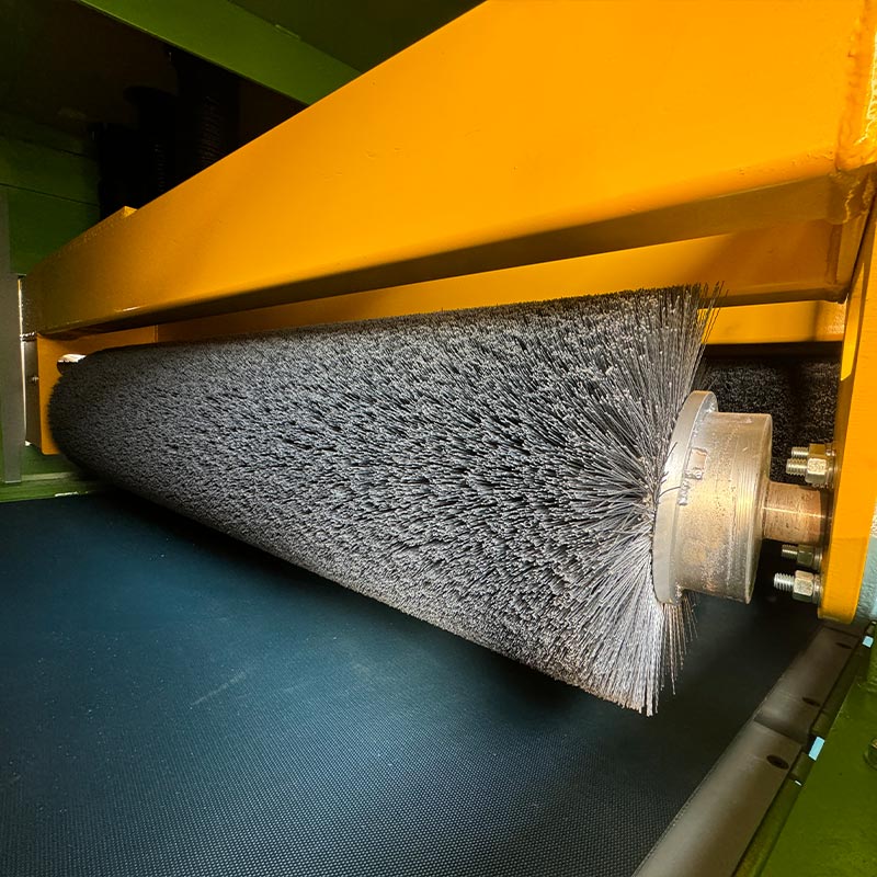 रबर ट्रॅक कन्व्हेयर सिस्टम, जेथे अपघर्षक ब्रश रोलर्सचे 8 संच क्रमशः खडबडीत आणि बारीक पूर्ण करतात